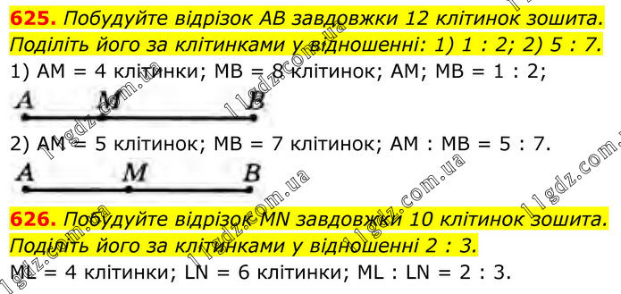 625. Побудуйте відрізок AB завдовжки 12 клітинок зошита. Поділіть його за клітинками у відношенні: 1) 1 : 2; 2) 5 : 7. 1) AM = 4 клітинки; MB = 8 клітинок; AM; MB = 1 : 2; 2) AM = 5 клітинок; MB = 7 клітинок; AM : MB = 5 : 7. 626. Побудуйте відрізок MN завдовжки 10 клітинок зошита. Поділіть його за клітинками у відношенні 2 : 3. ML = 4 клітинки; LN = 6 клітинки; ML : LN = 2 : 3.