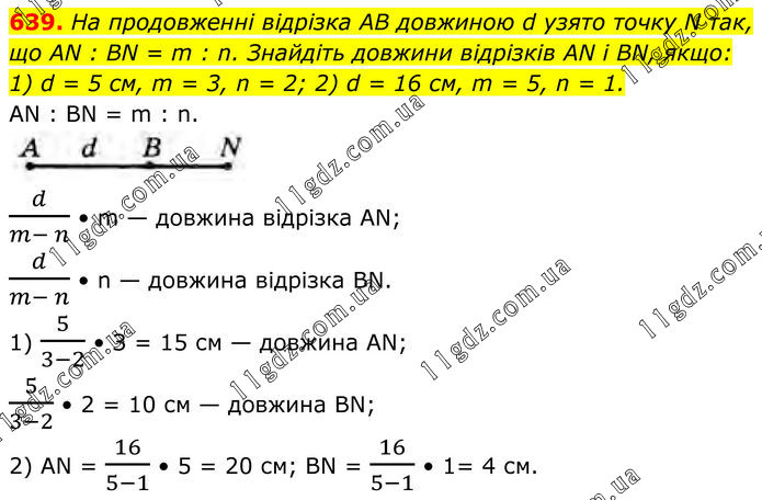 639. На продовженні відрізка AB довжиною d узято точку N так, що AN : BN = m : n. Знайдіть довжини відрізків AN і BN, якщо: 1) d = 5 см, m = 3, n = 2; 2) d = 16 см, m = 5, n = 1. AN : BN = m : n. d/(m- n) • m — довжина відрізка AN; d/(m- n) • n — довжина відрізка BN. 1) 5/(3-2) • З = 15 см — довжина AN; 5/(3-2) • 2 = 10 см — довжина BN; 2) АN = 16/(5-1) • 5 = 20 см; BN = 16/(5-1) • 1= 4 см.