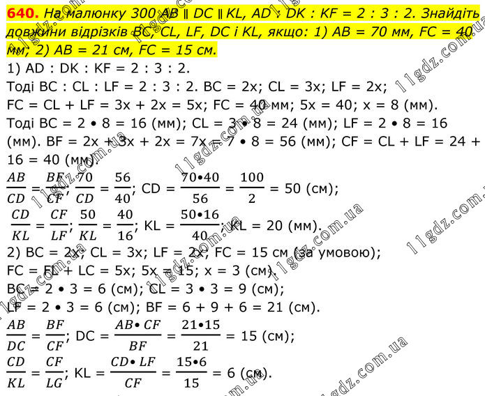 640. На малюнку 300 AB ∥ DC ∥ KL, AD : DK : KF = 2 : 3 : 2. Знайдіть довжини відрізків BC, CL, LF, DC і KL, якщо: 1) AB = 70 мм, FC = 40 мм; 2) AB = 21 см, FC = 15 см. 1) AD : DK : KF = 2 : 3 : 2. Тоді BC : CL : LF = 2 : 3 : 2. BC = 2x; CL = 3x; LF = 2x; FC = CL + LF = 3x + 2x = 5x; FC = 40 мм; 5x = 40; x = 8 (мм). Тоді ВС = 2 • 8 = 16 (мм); CL = 3 • 8 = 24 (мм); LF = 2 • 8 = 16 (мм). BF = 2x + Зx + 2х = 7x = 7 • 8 = 56 (мм); CF = CL + LF = 24 + 16 = 40 (мм). AB/CD = BF/CF; 70/CD = 56/40; CD = (70•40)/56 = 100/2 = 50 (см); CD/KL = CF/LF; 50/KL = 40/16; KL = (50•16)/40; KL = 20 (мм). 2) BC = 2x; CL = 3x; LF = 2x; FC = 15 cм (за умовою); FC = FL + LC = 5x; 5x = 15; x = 3 (cм). ВC = 2 • 3 = 6 (cм); CL = 3 • 3 = 9 (cм); LF = 2 • 3 = 6 (cм); ВF = 6 + 9 + 6 = 21 (cм). AB/DC = BF/CF; DC = (AB• CF)/BF = (21•15)/21 = 15 (см); CD/KL = CF/LG; KL = (CD• LF)/CF = (15•6)/15 = 6 (см).