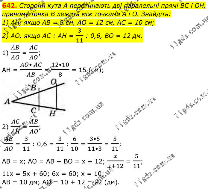 642. Сторони кута А перетинають дві паралельні прямі BC і ОН, причому точка В лежить між точками A і О. Знайдіть: 1) AH, якщо AB = 8 см, AO = 12 см, AC = 10 см; 2) AO, якщо AC : AH = 3/11 : 0,6, BO = 12 дм. 1) AB/AO = AC/AO; AH = (AO• AC)/AB = (12•10)/8 = 15 (см); 2) AC/AH = AB/AO; AB/AO = 3/11 : 0,6 = 3/11 : 6/10 = (3•5)/(11•3) = 5/11; AB = x; AO = AB + BO = x + 12; x/(x+12) = 5/11; 11x = 5x + 60; 6x = 60; x = 10; AB = 10 дм; AO = 10 + 12 = 22 (дм).