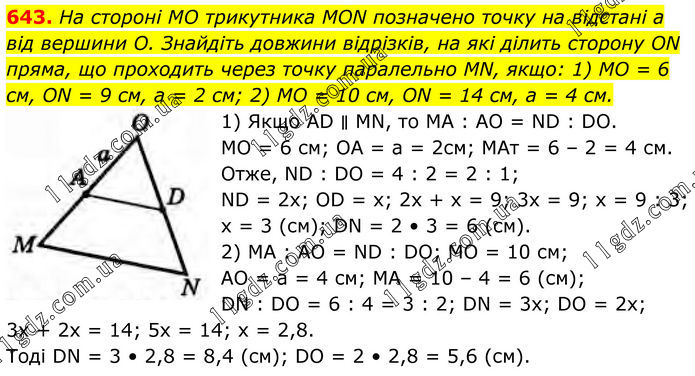 643. На стороні МО трикутника MON позначено точку на відстані а від вершини О. Знайдіть довжини відрізків, на які ділить сторону ON пряма, що проходить через точку паралельно MN, якщо: 1) MO = 6 см, ON = 9 см, a = 2 см; 2) MO = 10 см, ON = 14 см, a = 4 см. 1) Якщо AD ∥ MN, то MA : AO = ND : DO. MO = 6 cм; ОA = a = 2см; MAт = 6 – 2 = 4 см. Отже, ND : DO = 4 : 2 = 2 : 1; ND = 2x; OD = x; 2x + x = 9; 3x = 9; x = 9 : 3; x = 3 (см); DN = 2 • 3 = 6 (см). 2) MA : AO = ND : DO; MO = 10 см; AO = а = 4 cм; MA = 10 – 4 = 6 (см); DN : DO = 6 : 4 = 3 : 2; DN = 3x; DO = 2x; 3x + 2x = 14; 5x = 14; x = 2,8. Тоді DN = 3 • 2,8 = 8,4 (cм); DO = 2 • 2,8 = 5,6 (см).