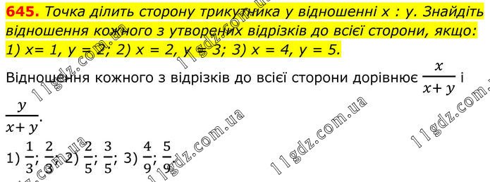645. Точка ділить сторону трикутника у відношенні х : у. Знайдіть відношення кожного з утворених відрізків до всієї сторони, якщо: 1) х= 1, у = 2; 2) х = 2, у = 3; 3) x = 4, y = 5. Відношення кожного з відрізків до всієї сторони дорівнює x/(x+ y) і y/(x+ y). 1) 1/3; 2/3; 2) 2/5; 3/5; 3) 4/9; 5/9.