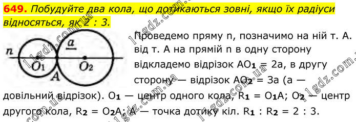 649. Побудуйте два кола, що дотикаються зовні, якщо їх радіуси відносяться, як 2 : 3. Проведемо пряму n, позначимо на ній т. А. від т. А на прямій n в одну сторону відкладемо відрізок AО1 = 2а, в другу сторону — відрізок АО2 = За (а — довільний відрізок). О1 — центр одного кола, R1 = O1A; O2 — центр другого кола, R2 = О2А; А — точка дотику кіл. R1 : R2 = 2 : 3.