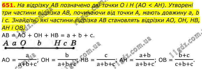 651. На відрізку AB позначено дві точки O і H (AO < AH). Утворені три частини відрізка AB, починаючи від точки А, мають довжину а, b і с. Знайдіть, які частини відрізка AB становлять відрізки AO, ОН, HB, AH і OB. AB = AO + OH + HB = a + b + c. AO = a/(a+b+c); OH = b/(a+b+c); HB = c/(a+b+c); AH = (a+b)/(a+b+c); OB = (b+c)/(c+b+c).