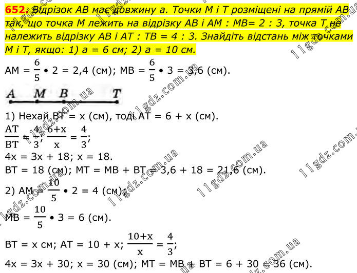 652. Відрізок AB має довжину а. Точки M і T розміщені на прямій AB так, що точка M лежить на відрізку AB і AM : MB= 2 : 3, точка T не належить відрізку AB i AT : TB = 4 : 3. Знайдіть відстань між точками М i Т, якщо: 1) а = 6 см; 2) а = 10 см. AM = 6/5 • 2 = 2,4 (см); МВ = 6/5 • 3 = 3,6 (см). 1) Нехай ВТ = х (см), тоді АТ = 6 + x (см). AT/BT = 4/3; (6+x)/x = 4/3; 4х = Зх + 18; х = 18. ВТ = 18 (см); МТ = МВ + ВT = 3,6 + 18 = 21,6 (см). 2) АМ = 10/5 • 2 = 4 (см); МВ = 10/5 • З = 6 (см). ВТ = x см; АТ = 10 + x; (10+x)/x = 4/3; 4x = Зx + 30; x = 30 (см); МТ = МВ + ВТ = 6 + 30 = 36 (см).