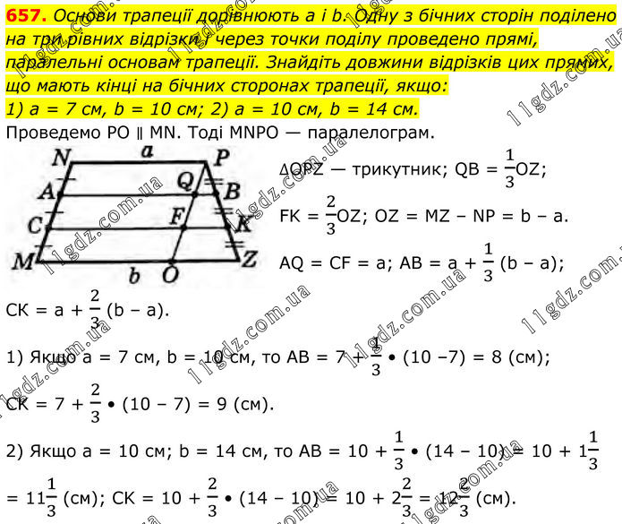 657. Основи трапеції дорівнюють а і b. Одну з бічних сторін поділено на три рівних відрізки і через точки поділу проведено прямі, паралельні основам трапеції. Знайдіть довжини відрізків цих прямих, що мають кінці на бічних сторонах трапеції, якщо: 1) а = 7 см, b = 10 см; 2) а = 10 см, b = 14 см. Проведемо PO ∥ MN. Тоді MNPO — паралелограм. ∆OPZ — трикутник; QB = 1/3OZ; FK = 2/3OZ; OZ = MZ – NP = b – a. AQ = CF = a; AB = a + 1/3 (b – a); СК = а + 2/3 (b – а). 1) Якщо а = 7 см, b = 10 см, то AB = 7 + 1/3 • (10 –7) = 8 (см); CK = 7 + 2/3 • (10 – 7) = 9 (см). 2) Якщо а = 10 см; b = 14 см, то АВ = 10 + 1/3 • (14 – 10) = 10 + 11/3 = 111/3 (см); CK = 10 + 2/3 • (14 – 10) = 10 + 22/3 = 122/3 (см).