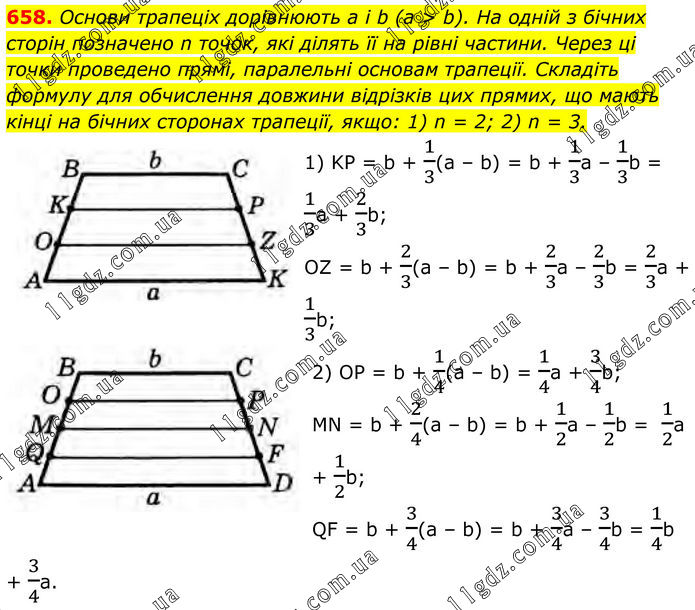 658. Основи трапеціх дорівнюють a і b (a > b). На одній з бічних сторін позначено n точок, які ділять її на рівні частини. Через ці точки проведено прямі, паралельні основам трапеції. Складіть формулу для обчислення довжини відрізків цих прямих, що мають кінці на бічних сторонах трапеції, якщо: 1) n = 2; 2) n = 3. 1) KP = b + 1/3(a – b) = b + 1/3a – 1/3b = 1/3a + 2/3b; OZ = b + 2/3(a – b) = b + 2/3a – 2/3b = 2/3a + 1/3b; 2) OP = b + 1/4(a – b) = 1/4a + 3/4b; MN = b + 2/4(a – b) = b + 1/2a – 1/2b = 1/2a + 1/2b; QF = b + 3/4(a – b) = b + 3/4a – 3/4b = 1/4b + 3/4a.