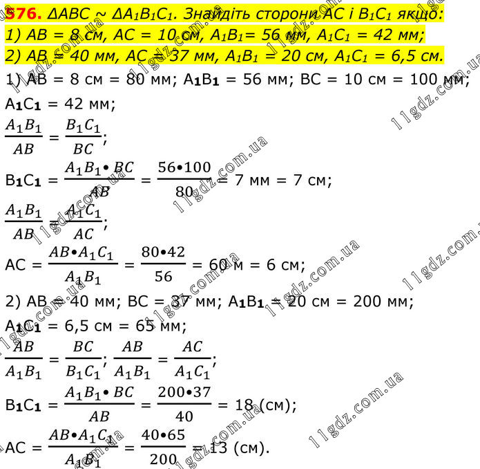 576. ∆АВС ~ ∆A1В1C1. Знайдіть сторони АС і В1С1 якщо: 1) AB = 8 cм, AC = 10 cм, А1В1= 56 мм, А1C1 = 42 мм; 2) АВ = 40 мм, AC = 37 мм, А1В1 = 20 cм, А1C1 = 6,5 см. 1) АВ = 8 см = 80 мм; A1В1 = 56 мм; ВС = 10 см = 100 мм; А1C1 = 42 мм; (A_1 B_1)/AB = (B_1 C_1)/BC; В1С1 = (A_1 B_1• BC)/AB = (56•100)/80 = 7 мм = 7 см; (A_1 B_1)/AB = (A_1 C_1)/AC; АС = (AB•A_1 C_1 )/(A_1 B_1 ) = (80•42)/56 = 60 м = 6 см; 2) АВ = 40 мм; ВС = 37 мм; А1В1 = 20 см = 200 мм; А1С1 = 6,5 см = 65 мм; AB/(A_1 B_1 ) = BC/(B_1 C_1 ); AB/(A_1 B_1 ) = AC/(A_1 C_1 ); В1С1 = (A_1 B_1• BC)/AB = (200•37)/40 = 18 (см); АС = (AB•A_1 C_1 )/(A_1 B_1 ) = (40•65)/200 = 13 (см).
