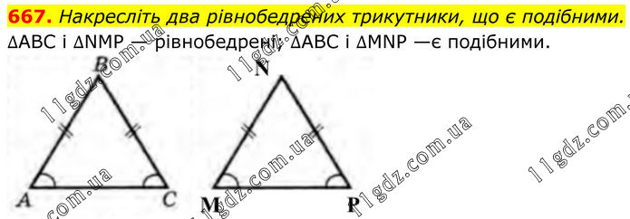 667. Накресліть два рівнобедрених трикутники, що є подібними. ∆АВС і ∆NMP — рівнобедрені; ∆АВС і ∆MNP —є подібними.