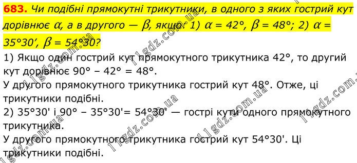 683. Чи подібні прямокутні трикутники, в одного з яких гострий кут дорівнює α, а в другого — β, якщо: 1) α = 42°, β = 48°; 2) α = 35°30’, β = 54°30? 1) Якщо один гострий кут прямокутного трикутника 42°, то другий кут дорівнює 90° – 42° = 48°. У другого прямокутного трикутника гострий кут 48°. Отже, ці трикутники подібні. 2) 35°30' і 90° – 35°30'= 54°30' — гострі кути одного прямокутного трикутника. У другого прямокутного трикутника гострий кут 54°30'. Ці трикутники подібні.