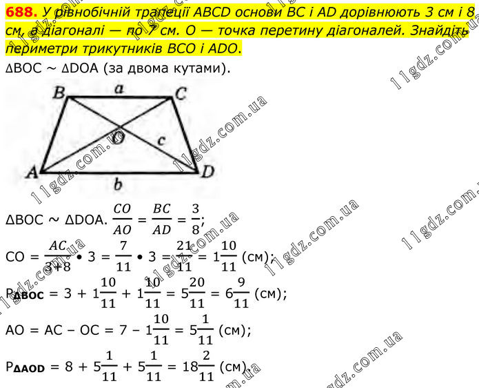 688. У рівнобічній трапеції ABCD основи BC і AD дорівнюють 3 см і 8 см, а діагоналі — по 7 см. O — точка перетину діагоналей. Знайдіть периметри трикутників BCO і ADO. ∆ВОС ~ ∆DОА (за двома кутами). ∆BOC ~ ∆DOA. CO/AO = BC/AD = 3/8; CO = AC/(3+8) • 3 = 7/11 • 3 = 21/11 = 110/11 (см); P∆BOC = 3 + 110/11 + 110/11 = 520/11 = 69/11 (см); AO = AC – OC = 7 – 110/11 = 51/11 (см); P∆AOD = 8 + 51/11 + 51/11 = 182/11 (см).