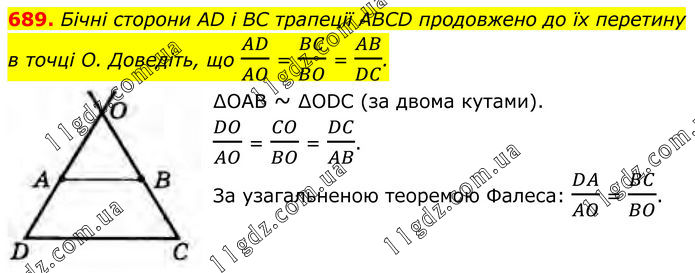 689. Бічні сторони AD і BC трапеції ABCD продовжено до їх перетину в точці О. Доведіть, що AD/AO = BC/BO = AB/DC. ∆OAB ~ ∆ODC (за двома кутами). DO/AO = CO/BO = DC/AB. За узагальненою теоремою Фалеса: DA/AO = BC/BO.
