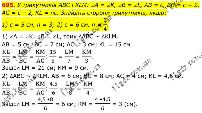 695. У трикутників ABC і KLM: ∠A = ∠K, ∠B = ∠L, AB = с, BC = с + 2, AC = с – 2, KL = nс. Знайдіть сторони трикутників, якщо: 1) с = 5 см, n = 3; 2) с = 6 см, n = 3/4. 1) ∠A = ∠K; ∠B = ∠L, тому ∆АВС ~ ∆KLM. AВ = 5 см; ВС = 7 см; АС = 3 см; KL = 15 см. KL/AB = LM/BC = KM/AC; 15/5 = LM/7 = KM/3. Звідси LM = 21 см; КМ = 9 см. 2) ∆АВС ~ ∆KLM. AВ = 6 см; ВС = 8 см; АС = 4 см; KL = 4,5 см. KL/AB = LM/BC = KM/AC; 4,5/6 = LM/8 = KM/4. Звідси LM = (4,5 •8)/6 = 6 см; КM = (4 •4,5)/6 = 3 (см).