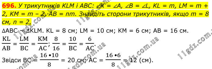 696. У трикутників KLM і ABC: ∠K = ∠A, ∠B = ∠L, KL = m, LM = m + 2, KM = m – 2, AB = nm. Знайдіть сторони трикутників, якщо m = 8 см, n = 2. ∆АВС ~ ∆KLM. KL = 8 см; LM = 10 см; KM = 6 см; AB = 16 см. KL/AB = LM/BC = KM/AC; 8/16 = 10/BC = 6/AC. Звідси BC = (16 •10)/8 = 20 см; AC = (16 •6)/8 = 12 (см).