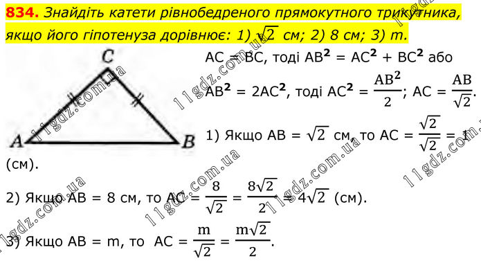 834. Знайдіть катети рівнобедреного прямокутного трикутника, якщо його гіпотенуза дорівнює: 1) √(2 ) cм; 2) 8 cм; 3) m. AC = BC, тоді AB2 = AC2 + BC2 або AB2 = 2AC2, тоді AC2 = AB^2/2; AC = AB/√2. 1) Якщо АВ = √(2 ) см, то АС = √(2 )/√(2 ) = 1 (см). 2) Якщо АВ = 8 см, то АС = 8/√(2 ) = (8√(2 ))/2 = 4√(2 ) (см). 3) Якщо АВ = m, то АС = m/√(2 ) = (m√(2 ))/2.