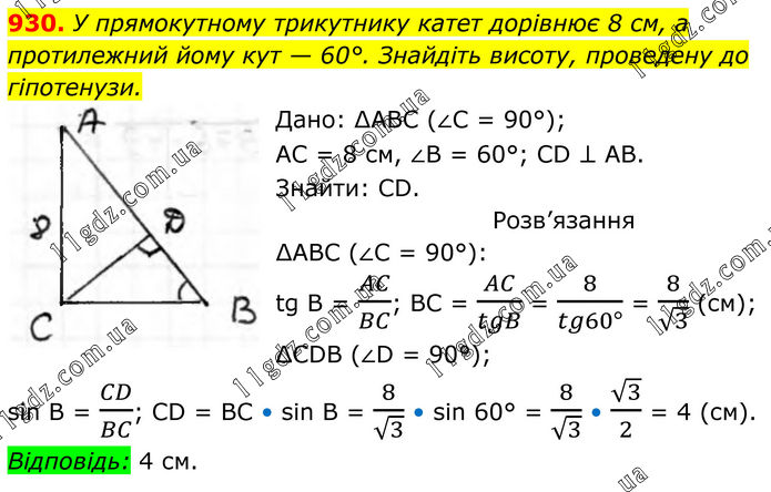 930. У прямокутному трикутнику катет дорівнює 8 см, а протилежний йому кут — 60°. Знайдіть висоту, проведену до гіпотенузи. Дано: ∆АВС (∠С = 90°); АС = 8 см, ∠В = 60°; CD ⊥ AB. Знайти: CD. Розв’язання ∆АВС (∠С = 90°): tg B = AC/BC; BC = AC/tgB = 8/(tg60°) = 8/√3 (см); ∆CDB (∠D = 90°); sin B = CD/BC; CD = BC • sin B = 8/√3 • sin 60° = 8/√3 • √3/2 = 4 (см). Відповідь: 4 см.