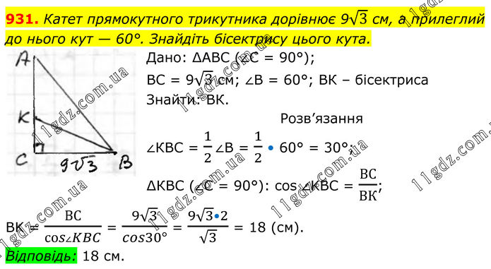 931. Катет прямокутного трикутника дорівнює 9√3 см, а прилеглий до нього кут — 60°. Знайдіть бісектрису цього кута. Дано: ∆АВС (∠С = 90°); ВС = 9√3 см; ∠В = 60°; ВК – бісектриса Знайти: ВК. Розв’язання ∠КВС = 1/2∠В = 1/2 • 60° = 30°; ∆КВС (∠С = 90°): cos ∠KBC = ВС/ВК; BK = ВС/(соs∠KBC) = (9√3)/(cos30°) = (9√3•2)/√3 = 18 (см). Відповідь: 18 см.