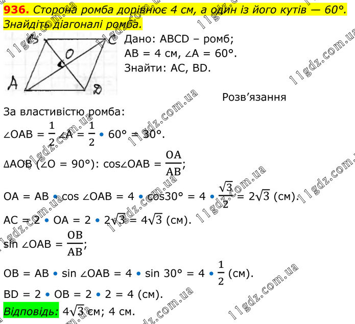 936. Сторона ромба дорівнює 4 см, а один із його кутів — 60°. Знайдіть діагоналі ромба. Дано: ABCD – ромб; АВ = 4 см, ∠А = 60°. Знайти: AC, BD. Розв’язання За властивістю ромба: ∠OAB = 1/2 ∠A = 1/2 • 60° = 30°. ∆AOB (∠O = 90°): cos∠OAB = OA/AB; OA = AB • cos ∠OAB = 4 • cos30° = 4 • √3/2 = 2√3 (см). АС = 2 • ОА = 2 • 2√3 = 4√3 (см). sin ∠OAB = OB/AB; OB = AB • sin ∠OAB = 4 • sin 30° = 4 • 1/2 (см). BD = 2 • OB = 2 • 2 = 4 (см). Відповідь: 4√3 см; 4 см.