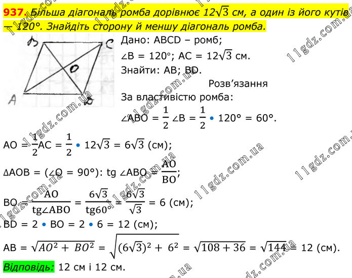 937. Більша діагональ ромба дорівнює 12√3 см, а один із його кутів — 120°. Знайдіть сторону й меншу діагональ ромба. Дано: ABCD – ромб; ∠В = 120°; АС = 12√3 см. Знайти: АВ; BD. Розв’язання За властивістю ромба: ∠ABO = 1/2∠B = 1/2 • 120° = 60°. AO = 1/2AC = 1/2 • 12√3 = 6√3 (см); ∆AOB = (∠O = 90°): tg∠ABO = AO/BO; BO = AO/(tg∠ABO) = (6√3)/(tg60°) = (6√3)/√3 = 6 (см); BD = 2 • BO = 2 • 6 = 12 (см); AB = √(〖AO〗^2+ 〖BO〗^2 ) = √(〖(6√3)〗^2+ 6^2 ) = √(108+36) = √144 = 12 (см). Відповідь: 12 см і 12 см.