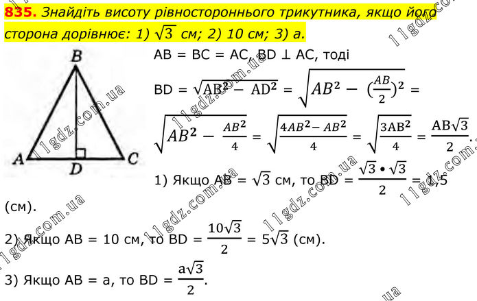 835. Знайдіть висоту рівностороннього трикутника, якщо його сторона дорівнює: 1) √(3 ) cм; 2) 10 см; 3) а. AB = BC = AC, BD ⊥ AC, тоді BD = √(AB^2- AD^2 ) = √(〖AB〗^2- (AB/2 )^2 ) = √(〖AB〗^2- 〖AB〗^2/4) = √((〖4AB〗^2- 〖AB〗^2)/4) = √(〖3AB〗^2/4) = (AB√3)/2. 1) Якщо АВ = √3 см, то BD = (√3 • √3)/2 = 1,5 (см). 2) Якщо АВ = 10 см, то BD = (10√3)/2 = 5√3 (см). 3) Якщо АВ = а, то BD = (a√3)/2.