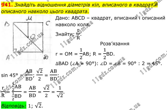 941. Знайдіть відношення діаметрів кіл, вписаного в квадрат й описаного навколо цього квадрата. Дано: ABCD – квадрат, вписаний і описаний навколо кола. Знайти: r/R. Розв’язання r = OM = 1/2AB; R = 1/2BD. ∆BAD (∠A = 90°): ∠D = ∠B = 90° : 2 = 45°. sin 45° = AB/BD; √2/2 = AB/BD; r/R = (1/2 AB)/(1/2 BD) = AB/BD = √2/2 = 1/√2. Відповідь: 1; √2.