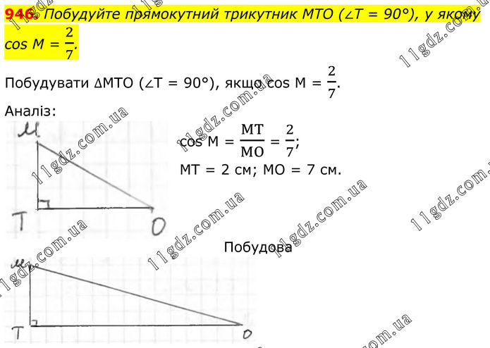 946. Побудуйте прямокутний трикутник MTO (∠T = 90°), у якому cos M = 2/7. Побудувати ∆МТО (∠Т = 90°), якщо cos M = 2/7. Аналіз: cos M = MT/MO = 2/7; MT = 2 см; МО = 7 см. Побудова