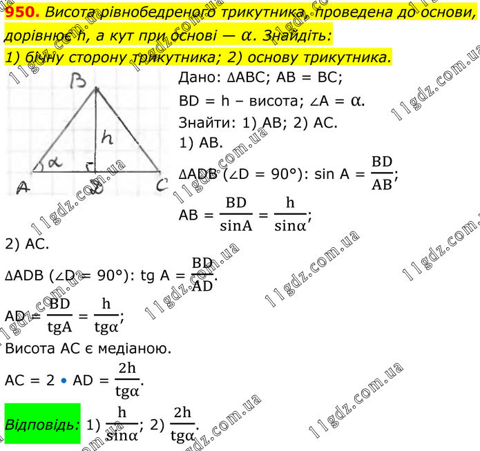 950. Висота рівнобедреного трикутника, проведена до основи, дорівнює h, а кут при основі — α. Знайдіть: 1) бічну сторону трикутника; 2) основу трикутника. Дано: ∆АВС; АВ = ВС; BD = h – висота; ∠А = α. Знайти: 1) АВ; 2) АС. 1) АВ. ∆ADB (∠D = 90°): sin A = BD/AB; AB = BD/sinA = h/sinα; 2) AC. ∆ADB (∠D = 90°): tg A = BD/AD. AD = BD/tgA = h/tgα; Висота АС є медіаною. AC = 2 • AD = 2h/tgα. Відповідь: 1) h/sinα; 2) 2h/tgα.