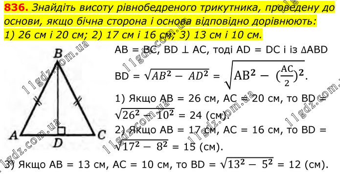 836. Знайдіть висоту рівнобедреного трикутника, проведену до основи, якщо бічна сторона і основа відповідно дорівнюють: 1) 26 см і 20 см; 2) 17 см і 16 см; 3) 13 см і 10 см. AB = BC, BD ⊥ AC, тоді АD = DC і із ∆AВD: BD = √(〖AB〗^2- 〖AD〗^2 ) = √(AB^2- (AC/2 )^2 ). 1) Якщо АВ = 26 см, AC = 20 см, то BD = √(26^2- 10^2 ) = 24 (см). 2) Якщо AB = 17 см, AC = 16 см, то BD = √(17^2- 8^2 ) = 15 (см). 3) Якщо AB = 13 см, АС = 10 см, то BD = √(13^2- 5^2 ) = 12 (см).