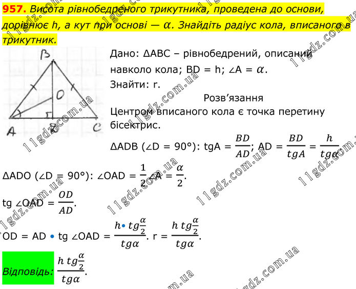 957. Висота рівнобедреного трикутника, проведена до основи, дорівнює h, а кут при основі — α. Знайдіть радіус кола, вписаного в трикутник. Дано: ∆ABC – рівнобедрений, описаний навколо кола; BD = h; ∠A = α. Знайти: r. Розв’язання Центром вписаного кола є точка перетину бісектрис. ∆АDB (∠D = 90°): tgA = BD/AD; AD = BD/tgA = h/tgα. ∆ADO (∠D = 90°): ∠OAD = 1/2∠A = α/2. tg ∠OAD = OD/AD. OD = AD • tg ∠OAD = (h• tg α/2)/tgα. r = (h tg α/2)/tgα. Відповідь: (h tg α/2)/tgα.