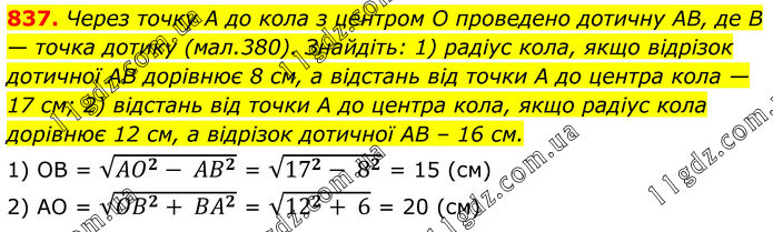 837. Через точку А до кола з центром O проведено дотичну AB, де В — точка дотику (мал.380). Знайдіть: 1) радіус кола, якщо відрізок дотичної AB дорівнює 8 см, а відстань від точки А до центра кола — 17 см; 2) відстань від точки А до центра кола, якщо радіус кола дорівнює 12 см, а відрізок дотичної AB – 16 см. 1) OB = √(〖AO〗^2- 〖AB〗^2 ) = √(17^2- 8^2 ) = 15 (см). 2) АO = √(〖OB〗^2+ 〖BA〗^2 ) = √(12^2+ 6) = 20 (см).