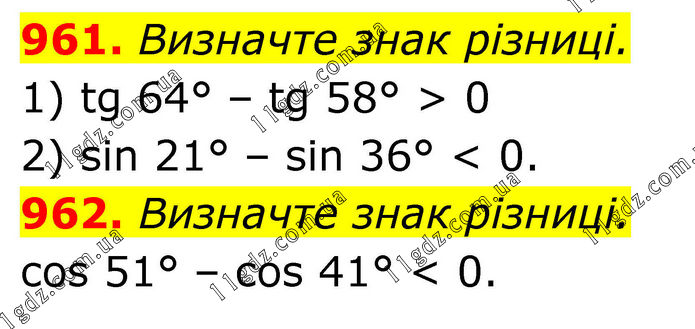 961. Визначте знак різниці. 1) tg 64° – tg 58° > 0; 2) sin 21° – sin 36° < 0. 962. Визначте знак різниці. cos 51° – cos 41° < 0.