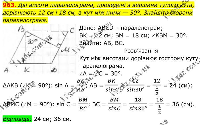 963. Дві висоти паралелограма, проведені з вершини тупого кута, дорівнюють 12 см і 18 см, а кут між ними — 30°. Знайдіть сторони паралелограма. Дано: ABCD – паралелограм; BK = 12 см; BM = 18 см; ∠KBM = 30°. Знайти: AB, BC. Розв’язання Кут між висотами дорівнює гострому куту паралелограма. ∠А = ∠С = 30°. ∆АКВ (∠К = 90°): sin A = BK/AB; AB = BK/sinA = 12/(sin30°) = 12/(1/2) = 24 (см); ∆ВМС (∠М = 90°): sin C = BM/BC; BC = BM/sinC = 18/(sin30°) = 18/(1/2) = 36 (см). Відповідь: 24 см; 36 см.