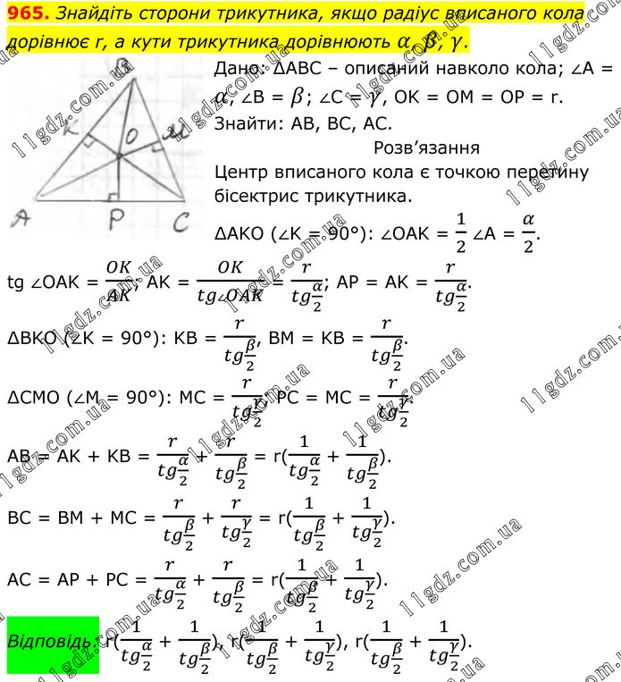 965. Знайдіть сторони трикутника, якщо радіус вписаного кола дорівнює r, а кути трикутника дорівнюють α, β, γ. Дано: ∆ABC – описаний навколо кола; ∠A = α, ∠B = β; ∠C = γ, OK = OM = OP = r. Знайти: AB, BC, AC. Розв’язання Центр вписаного кола є точкою перетину бісектрис трикутника. ∆AKO (∠K = 90°): ∠OAK = 1/2 ∠A = α/2. tg ∠OAK = OK/AK; AK = OK/(tg∠OAK) = r/(tg α/2); AP = AK = r/(tg α/2). ∆BKO (∠K = 90°): KB = r/(tg β/2), BM = KB = r/(tg β/2). ∆CMO (∠M = 90°): MC = r/(tg γ/2); PC = MC = r/(tg γ/2). AB = AK + KB = r/(tg α/2) + r/(tg β/2) = r(1/(tg α/2) + 1/(tg β/2)). BC = BM + MC = r/(tg β/2) + r/(tg γ/2) = r(1/(tg β/2) + 1/(tg γ/2)). AC = AP + PC = r/(tg α/2) + r/(tg β/2) = r(1/(tg β/2) + 1/(tg γ/2)). Відповідь: r(1/(tg α/2) + 1/(tg β/2)), r(1/(tg β/2) + 1/(tg γ/2)), r(1/(tg β/2) + 1/(tg γ/2)).