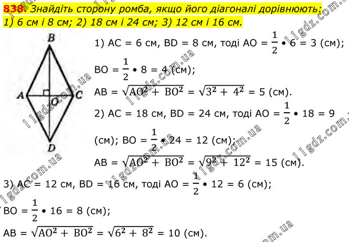 838. Знайдіть сторону ромба, якщо його діагоналі дорівнюють: 1) 6 см і 8 см; 2) 18 см і 24 см; 3) 12 см і 16 см. 1) AC = 6 см, BD = 8 см, тоді АО = 1/2 • 6 = 3 (см); ВО = 1/2 • 8 = 4 (см); АВ = √(〖АО〗^2+ 〖ВО〗^2 ) = √(3^2+ 4^2 ) = 5 (см). 2) AC = 18 см, BD = 24 см, тоді АО = 1/2 • 18 = 9 (см); ВО = 1/2 • 24 = 12 (см); АВ = √(〖АО〗^2+ 〖ВО〗^2 ) = √(9^2+ 12^2 ) = 15 (см). 3) AC = 12 см, BD = 16 см, тоді АО = 1/2 • 12 = 6 (см); ВО = 1/2 • 16 = 8 (см); АВ = √(〖АО〗^2+ 〖ВО〗^2 ) = √(6^2+ 8^2 ) = 10 (см).