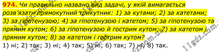 974. Чи правильно названо вид задачі, у якій вимагається розв’язати прямокутний трикутник: 1) за кутами; 2) за катетами; 3) за гіпотенузою; 4) за гіпотенузою і катетом; 5) за гіпотенузою та прямим кутом; 6) за гіпотенузою й гострим кутом; 7) за катетом і прямим кутом; 8) за катетом і гострим кутом? 1) ні; 2) так; 3) ні; 4) так; 5) ні; 6) так; 7) ні; 8) так.