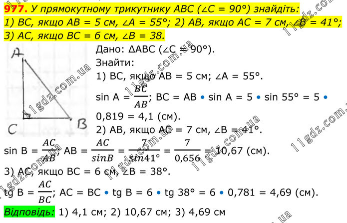 977. У прямокутному трикутнику ABC (∠C = 90°) знайдіть: 1) BC, якщо AB = 5 см, ∠A = 55°; 2) AB, якщо AC = 7 см, ∠B = 41°; 3) AC, якщо BC = б см, ∠B = 38. Дано: ∆АВС (∠C = 90°). Знайти: 1) ВС, якщо AB = 5 см; ∠А = 55°. sin A = BC/AB; BC = AB • sin A = 5 • sin 55° = 5 • 0,819 = 4,1 (см). 2) АВ, якщо АС = 7 см, ∠В = 41°. sin B = AC/AB; AB = AC/sinB = 7/(sin41°) = 7/0,656 = 10,67 (см). 3) АС, якщо ВС = 6 см, ∠В = 38°. tg B = AC/BC; AC = BC • tg B = 6 • tg 38° = 6 • 0,781 = 4,69 (см). Відповідь: 1) 4,1 см; 2) 10,67 см; 3) 4,69 см.