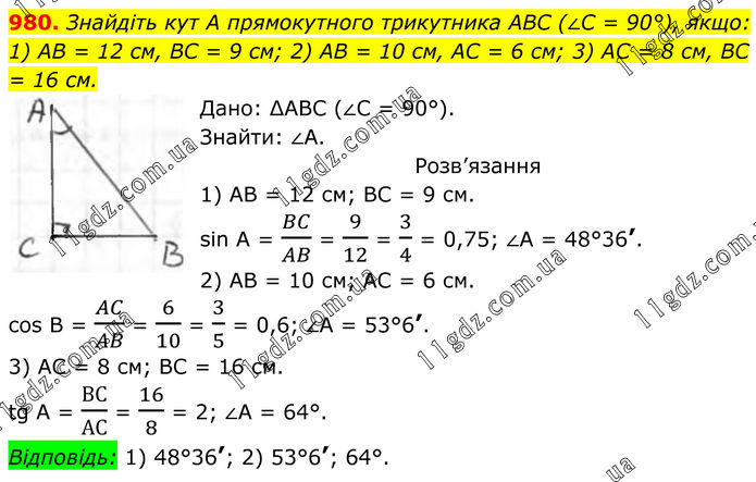 980. Знайдіть кут А прямокутного трикутника ABC (∠C = 90°), якщо: 1) AB = 12 см, BC = 9 см; 2) AB = 10 см, AC = 6 см; 3) AC = 8 см, BC = 16 см. Дано: ∆АВС (∠C = 90°). Знайти: ∠А. Розв’язання 1) АВ = 12 см; ВС = 9 см. sin A = BC/AB = 9/12 = 3/4 = 0,75; ∠A = 48°36’. 2) AB = 10 см; АС = 6 см. cos B = AC/AB = 6/10 = 3/5 = 0,6; ∠A = 53°6’. 3) AC = 8 см; ВС = 16 см. tg A = ВС/АС = 16/8 = 2; ∠A = 64°. Відповідь: 1) 48°36’; 2) 53°6’; 64°.