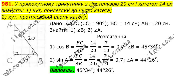 981. У прямокутному трикутнику з гіпотенузою 20 см і катетом 14 см знайдіть: 1) кут, прилеглий до цього катета; 2) кут, протилежний цьому катету. Дано: ∆АВС (∠C = 90°); BC = 14 см; АВ = 20 см. Знайти: 1) ∠В; 2) ∠А. Розв’язання 1) cos B = BC/AB = 14/20 = 7/10 = 0,7; ∠B = 45°34’. 2) sin A = BC/AB = 14/20 = 7/10 = 0,7; ∠A = 44°26’. Відповідь: 45°34’; 44°26’.
