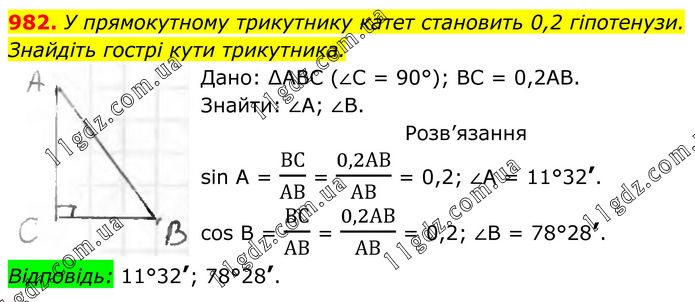982. У прямокутному трикутнику катет становить 0,2 гіпотенузи. Знайдіть гострі кути трикутника. Дано: ∆АВС (∠C = 90°); BC = 0,2AB. Знайти: ∠А; ∠В. Розв’язання sin A = ВС/АВ = 0,2АВ/АВ = 0,2; ∠A = 11°32’. cos B = ВС/АВ = 0,2АВ/АВ = 0,2; ∠B = 78°28’. Відповідь: 11°32’; 78°28’.