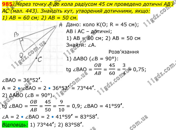 985. Через точку А до кола радіусом 45 см проведено дотичні AB і AC (мал. 443). Знайдіть кут, утворений дотичними, якщо: 1) АВ = 60 см; 2) АВ = 50 см. Дано: коло K(O; R = 45 см); АВ і АС – дотичні; 1) АВ = 60 см; 2) АВ = 50 см Знайти: ∠А. Розв’язання 1) ∆АВО (∠В = 90°): tg ∠BAO = OB/AB = 45/60 = 3/4 = 0,75; ∠BAO = 36°52’. A = 2 • ∠BAO = 2 • 36°52’ = 73°44’. 2) ∆ABO (∠B = 90°). tg ∠BAO = OB/AB = 45/50 = 9/10 = 0,9; ∠BAO = 41°59’. ∠А = 2 • ∠ВАО = 2 • 41°59’ = 83°58’. Відповідь: 1) 73°44’; 2) 83°58’.
