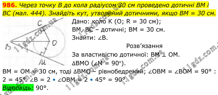 986. Через точку В до кола радіусом 30 см проведено дотичні BM і BC (мал. 444). Знайдіть кут, утворений дотичними, якщо BM = 30 см. Дано: коло К (О; R = 30 см); ВМ, ВС – дотичні; ВМ = 30 см. Знайти: ∠В. Розв’язання За властивістю дотичної: ВМ ⊥ ОМ. ∆ВМО (∠М = 90°). ВМ = ОМ = 30 см, тоді ∆ВМО – рівнобедрений; ∠ОВМ = ∠ВОМ = 90° : 2 = 45°. ∠В = 2 • ∠ОВМ = 2 • 45° = 90°. Відповідь: 90°.