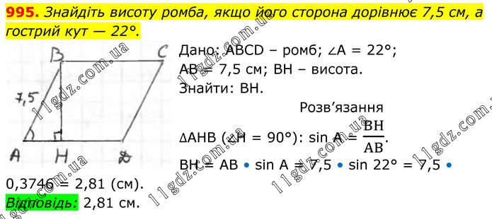 995. Знайдіть висоту ромба, якщо його сторона дорівнює 7,5 см, а гострий кут — 22°. Дано: ABCD – ромб; ∠А = 22°; АВ = 7,5 см; ВН – висота. Знайти: ВН. Розв’язання ∆AHB (∠H = 90°): sin A = BH/AB. BH = AB • sin A = 7,5 • sin 22° = 7,5 • 0,3746 = 2,81 (см). Відповідь: 2,81 см.