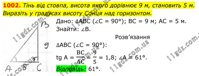 1002. Тінь від стовпа, висота якого дорівнює 9 м, становить 5 м. Виразіть у градусах висоту Сонця над горизонтом. Дано: ∆АВС (∠С = 90°); ВС = 9 м; АС = 5 м. Знайти: ∠В. Розв’язання ∆АВС (∠С = 90°): tg A = BC/AC = 9/5 = 1,8; ∠A = 61°. Відповідь: 61°.