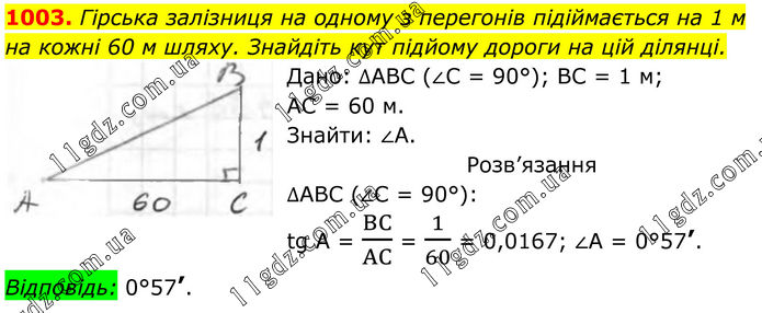 1003. Гірська залізниця на одному з перегонів підіймається на 1 м на кожні 60 м шляху. Знайдіть кут підйому дороги на цій ділянці. Дано: ∆АВС (∠С = 90°); ВС = 1 м; АС = 60 м. Знайти: ∠А. Розв’язання ∆АВС (∠С = 90°): tg A = BC/AC = 1/60 = 0,0167; ∠A = 0°57’. Відповідь: 0°57’.