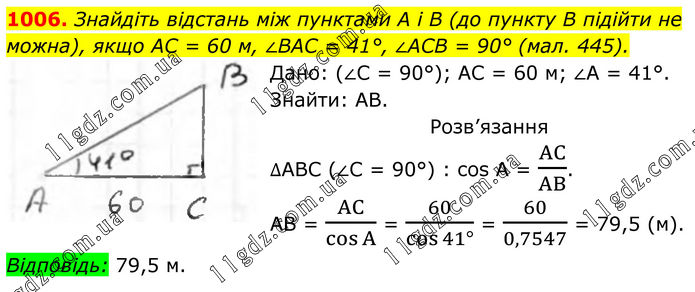 1006. Знайдіть відстань між пунктами A i B (до пункту В підійти не можна), якщо AC = 60 м, ∠BAC = 41°, ∠ACB = 90° (мал. 445). Дано: (∠С = 90°); АС = 60 м; ∠А = 41°. Знайти: АВ. Розв’язання ∆АВС (∠С = 90°) : cos A = AC/AB. AB = AC/cosA = 60/cos〖41°〗 = 60/0,7547 = 79,5 (м). Відповідь: 79,5 м.