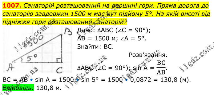 1007. Санаторій розташований на вершині гори. Пряма дорога до санаторію завдовжки 1500 м має кут підйому 5°. На якій висоті від підніжжя гори розташований санаторій? Дано: ∆АВС (∠С = 90°); АВ = 1500 м; ∠А = 5°. Знайти: ВС. Розв’язання. ∆АВС (∠С = 90°); sin A = BC/AB. BC = AB • sin A = 1500 • sin 5° = 1500 • 0,0872 = 130,8 (м). Відповідь: 130,8 м.