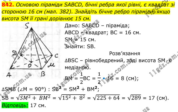 842. Основою піраміди SABCD, бічні ребра якої рівні, є квадрат зі стороною 16 см (мал. 382). Знайдіть бічне ребро піраміди, якщо висота SM її грані дорівнює 15 см. Дано: SABCD – піраміда; ABCD – квадрат; ВС = 16 см. SM = 15 см. Знайти: SB. Розв’язання ∆BSC – рівнобедрений, тоді висота SM є медіаною. ВМ = 1/2ВС = 1/2 • 16 = 8 (см); ∆SMB (∠M = 90°) : SB2 = SM2 + BM2; SB = √(〖SM〗^2+ 〖BM〗^2 ) = √(15^2+ 8^2 ) = √(225+64) = √289 = 17 (см). Відповідь: 17 см.