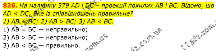 826. На малюнку 379 AD і DC – проекції похилих AB і BC. Відомо, що AD < DC. Яке із співвідношень правильне? 1) AB = BC; 2) АВ > ВС; 3) AB < BC. 1) AB = ВС — неправильно; 2) AB > ВС — неправильно; 3) AB < ВС — правильно.