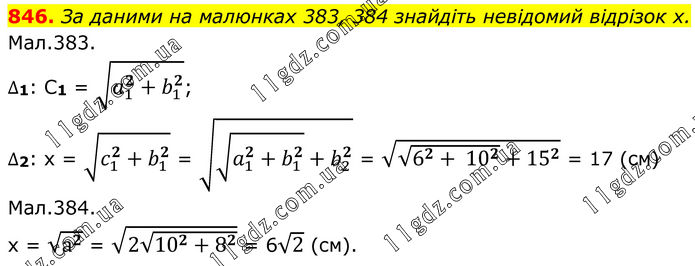846. За даними на малюнках 383, 384 знайдіть невідомий відрізок х. Мал.383. ∆1: C1 = √(a_1^2+b_1^2 ); ∆2: x = √(c_1^2+b_1^2 ) = √(√(a_1^2+b_1^2 )+b_2^2 ) = √(√(6^2+ 10^2 )+15^2 ) = 17 (см) Мал.384. х = √(а^2 ) = √(2√(10^2+8^2 )) = 6√2 (см).