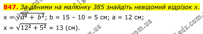 847. За даними на малюнку 385 знайдіть невідомий відрізок х. x = √(a^2+ b^2 ); b = 15 – 10 = 5 см; a = 12 см; x = √(12^2+5^2 ) = 13 (см).